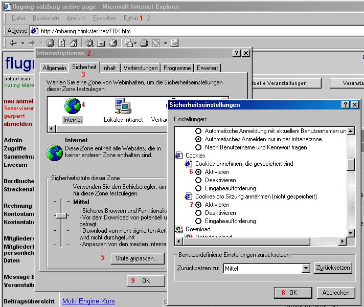 Temporäre Cookies angelegt werden. Bitte erlaube in Deinem Browser das Anlegen von Cookies. Cookies werden von der active-page benötigt, um während der Sitzung den LoginString zu führen. Temporäre Cookies schreiben keine Informationen auf die Festplatte und werden mit Beendigung des Browsers automatisch aus dem System entfernt. Um Cookies zu aktivieren, folge den Nummern im Menü Extras / Internetoptionen direkt in Deinem Browser: |
